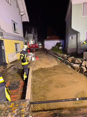 Die umliegenden Gebäude wurden mit Sandsäcken abgedichtet. Durch die Baufirma wurde mit zwei Baggern ein Abfluss hergestellt.