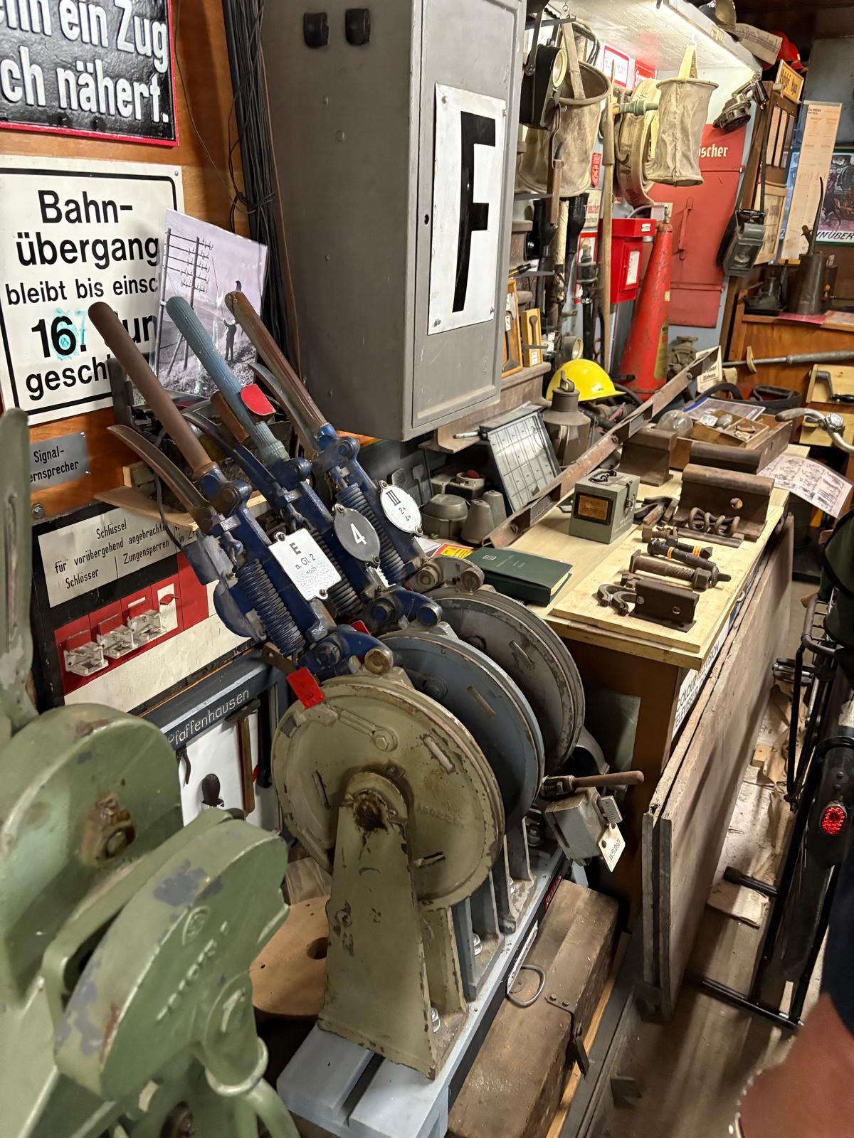 Mit ganz großem Fachwissen aus seiner über 40-jährigen Tätigkeit bei der Deutschen (Bundes) Bahn und viel Freude und Engagement brachte uns der Ausstellungsleiter den Arbeitsalltag des gesamten Bahnbetriebs näher. Die gesammelten Werkzeuge und Ausrüstungen sind auf 3 Etagen verteilt, wobei das Stellwerk noch im Orginal zu bewundern ist. Auch ein Fahrkartenschalter ist noch betriebsbereit vorhanden.
